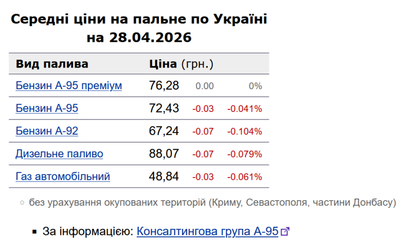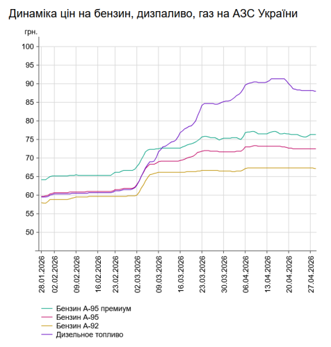Як повідомлялось, у понеділок, 27 квітня, середня ціна на бензин марки А-95 зросла на 2 коп. до 72,46 грн/л, на дизельне пальне – на 4 коп. до 88,14 грн/л.