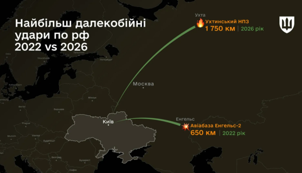 Дрони вже б’ють на 1 750 кілометрів: Україна в 2,5 раза збільшила дальність deep strike по Росії Інфографіка 28.04.2026 13:21 Укрінформ Українські далекобійні засоби здатні уразити військові об'єкти в тилу Росії на відстані близько 1 750 км, з 2022 року дальність зросла у понад 2,5 раза.