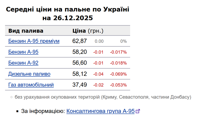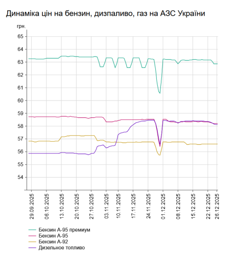 Зокрема, зафіксовано такі середні ціни на пальне: бензин марки А-95 (преміум) – 62,87 грн/л; бензин марки А-95 – 58,2 грн/л (здешевшав на 1 коп.); бензин марки А-92 – 56,6 грн/л (здешевшав на 1 коп.); дизельне пальне – 58,12 грн/л (здешевшало на 4 коп.). Середня ціна автогазу становить 37,49 грн/л, що на 2 коп. менше порівняно із 24 грудня.