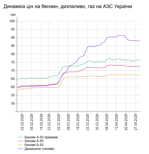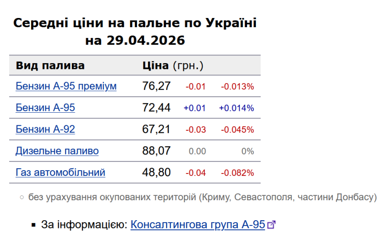 Як повідомлялось, у вівторок, 28 квітня, середня ціна на бензин марки А-95 знизилася на 3 коп. до 72,43 грн/л, на дизельне пальне – на 7 коп. до 88,07 грн/л.