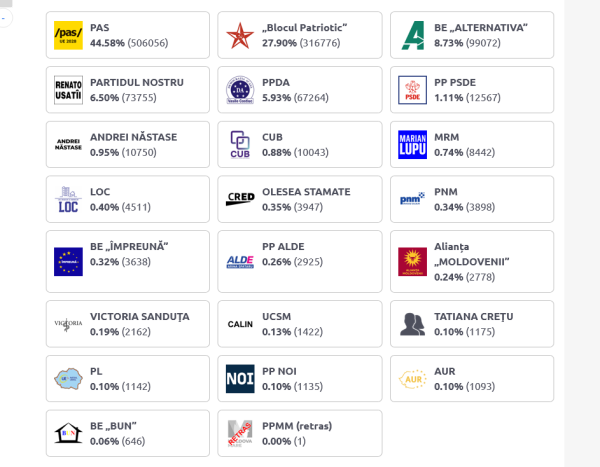У Молдові оброблені понад 80% бюлетенів, лідерство утримує проєвропейська «Дія і солідарність» (PAS), яка випереджає проросійський Патріотичний блок.