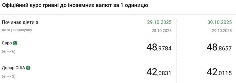 - 1 долар США – 42,01 грн (42,08 грн станом на 29 жовтня);