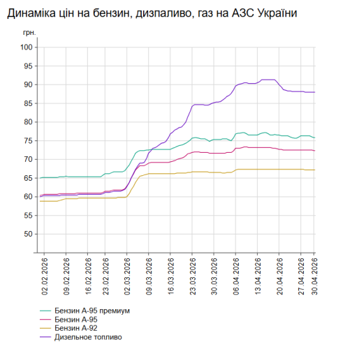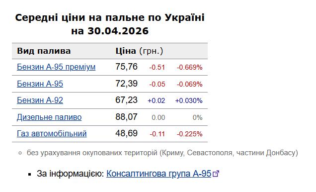 Як повідомлялось, у середу, 29 квітня, середня ціна на бензин марки А-95 зросла на 1 коп. до 72,44 грн/л, на дизельне пальне – зафіксувалася на рівні 88,07 грн/л.