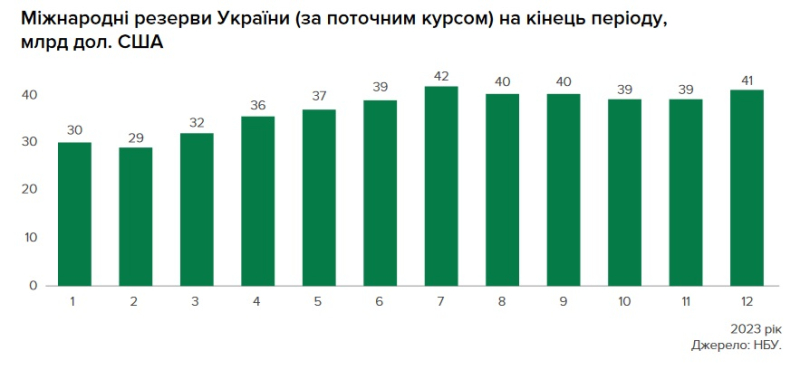 Рівень міжнародних резервів завдяки зовнішньому фінансуванню у 2023 році збільшився на 42% – до 40,5 млрд дол. США.