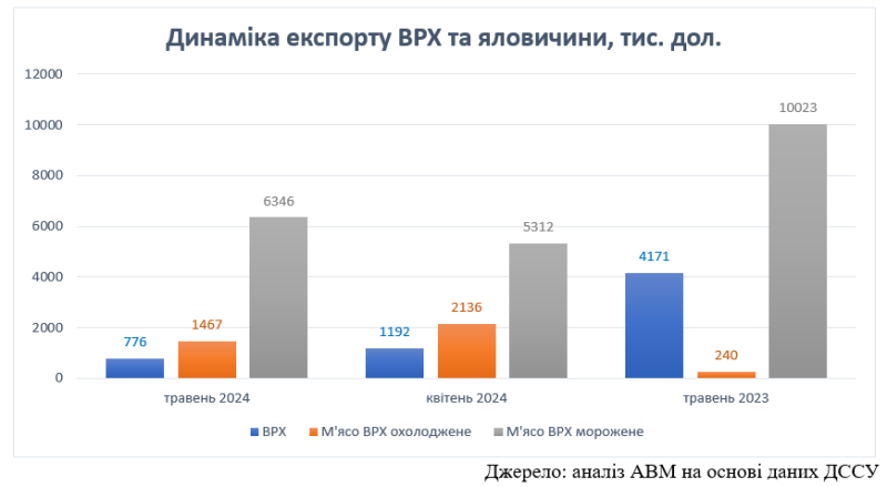 У той же час у травні 2024 року Україна експортувала 529 т ВРХ живою вагою, що на 35% менше порівняно до квітня і на 350% менше порівняно до травня 2023-го. Виручка за поставлених тварин склала 776 тис. дол. і зменшилась на 54% порівняно до квітня поточного року і на 438% порівняно до травня 2023-го. Всі поставки були спрямовані до Лівану. В січні-травні 2024 року Україна експортувала 3,76 тис. т ВРХ (-174%) на суму 6,36 млн дол. (-159%).