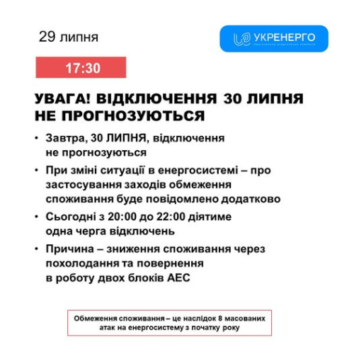 «30 липня, відключення не прогнозуються. При зміні ситуації в енергосистемі – про застосування заходів обмеження споживання буде повідомлено додатково», – йдеться в повідомленні.