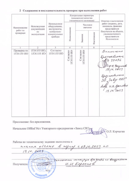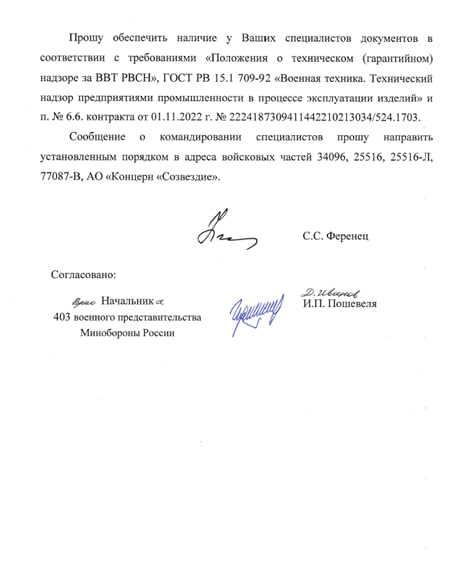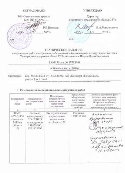 Менше ніж за два місяці після листа-виклику – 3 жовтня – з’явилося технічне завдання, яке підписав директор «Заводу СВТ» В. Міклашевич та погодив в.о. начальника групи 1281 міноборони РФ Р. Поляков. Згодом інженер заводу Ігор Адамович з 9 по 19 жовтня 2023 р. виконав повне обслуговування апаратури бойового управління B119 на тому самому об’єкті. Роботу прийняли російські офіцери – заступник командира в/ч 34096 з озброєння І. Береснєв та інший представник частини О. Чекунаєв.