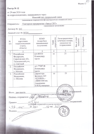 Інші наявні в Укрінформу документи свідчать, що транспортування складників, обладнання та документації до російських військових структур відбувалася через білоруське державне підприємство «Спєцсвязь» («Мінський цех спеціального зв’язку»). Водночас «Завод СВТ» далі підтримував бойовий потенціал російських стратегічних ракетних військ і у 2024 році.