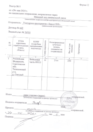 Зокрема, 29 травня 2024 року через «Спєцсвязь» білоруси відправили секретний вантаж вагою 250 кг до військової частини 89553 – це 60 ракетна дивізія у складі 27 ракетної армії в ЗАТО «Свєтлий» Саратовської області РФ.