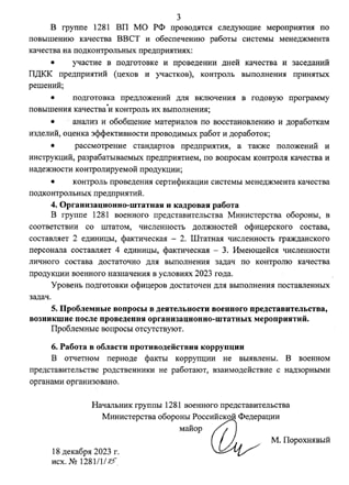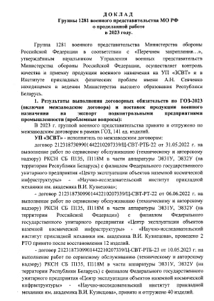 Білоруська опозиційна організація отримала доступ до доповіді «про виконану роботу за 2023 рік» російського майора М. Порохнявого – керівника «групи 1281 військового представництва міністерства оборони РФ», яка здійснює контроль якості та приймання продукції на цьому заводі. Згідно з нею, у 2023 році «Завод СВТ» виконував щонайменше п’ять міжзаводських договорів за державним оборонним замовленням РФ.
