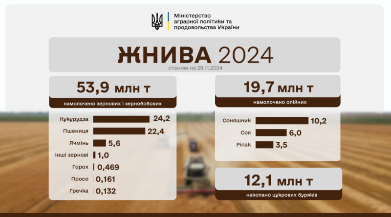 Жнива в Україні добігають кінця; станом на 29 листопада намолочено 73,6 млн т нового врожаю зернових та олійних культур, який зібрано на площі 19,5 млн га.