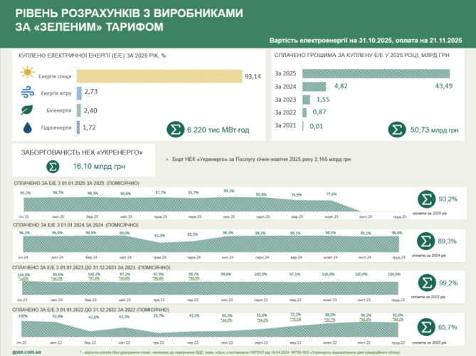 Рівень розрахунків "Гарантованого покупця" перед виробниками "зеленої" енергії становить: за 2025 рік – 93,2%, за 2024 рік – 89,3%, за 2023 рік – 99,2%, за 2022 рік – 65,7%.